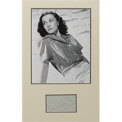 Vintage fountain pen signature, “Vivien Leigh,” on a light green album page. Double matted with a glossy photo of Leigh to an overall size of 10.5 x 1