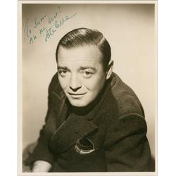 Glossy 8 x 9.75 photo of a neatly attired Henreid relaxing in a chair, signed in blue felt tip. In fine condition, with a lightly trimmed top.