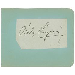 Vintage fountain pen signature, “Bela Lugosi,” on an off-white 3.75 x 2 irregularly clipped slip affixed to a 5.25 x 4.5 light green album page. In fi