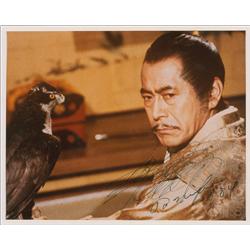 Color glossy 10 x 8 photo of Mifune as a samurai with a falcon on his arm from one of his films, signed in black felt tip. In fine condition.