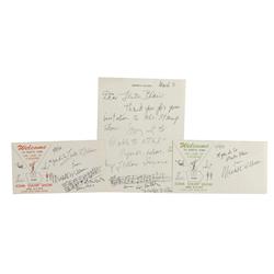 Eleven ink and pencil signatures on individual off-white and bright yellow 3.5 x 2 cards, with a few of the cards being Hollywood Coffee Service busin