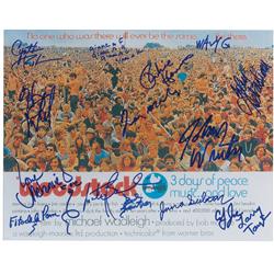 Color glossy 14 x 11 photo of a Woodstock movie poster, signed in blue felt tip by 14 performers: Richie Havens, John Sebastian, Johnny Winter, Wavy G