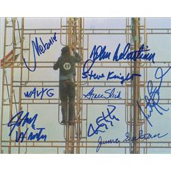 Color glossy 10 x 8 photo of a rigger on the scaffold at Woodstock, signed in blue felt tip by Grace Slick, Melanie, John Sebastian, Johnny Winter, Wa