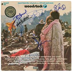 Woodstock soundtrack album signed on the front cover in blue and black felt tip by six performers: Pete Townshend, Arlo Guthrie, Jorma Kaukonen, Count