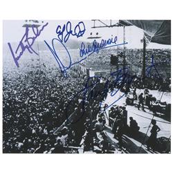 Color glossy 11 x 14 photo of a Woodstock poster, signed in felt tip by nine performers including: Pete Townshend, Arlo Guthrie, Country Joe McDonald,