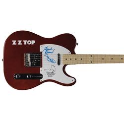 Red-bodied Copley ‘telecaster-style’ electric guitar, with the band’s name on the body, signed on the white pickguard in blue ink by Dusty Hill and Fr