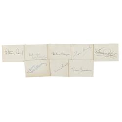 Eight fountain pen signatures on individual off-white 3.5 x 2.5 cards. Signers are: Warner Baxter, Katherine Cornell, Maurice Evans, Helen Hayes, Fred