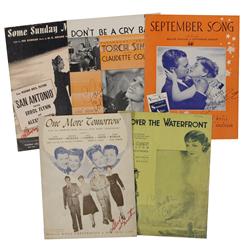 Five pieces of sheet music from various films, each signed on the cover in felt tip by an actress from the film. Signers are: Claudette Colbert (‘I Co