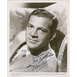 Vintage glossy 8 x 10 RKO publicity photo, signed and inscribed in fountain pen “To Donna, With Best Wishes, Dana Andrews.” In fine condition, with li