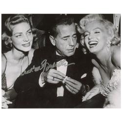 Satin-finish 10 x 8 photo of Humphrey Bogart sneaking a peek at Marilyn Monroe’s cleavage, right under the nose of Lauren Bacall, signed in silver ink