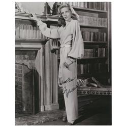 Glossy 11 x 14 full-length photo of Bacall standing next to a fireplace, signed in black felt tip. In very fine condition.