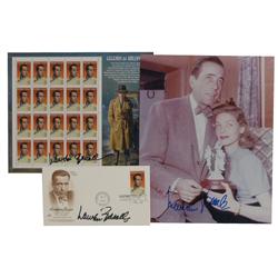 Three items: color glossy 8 x 10 photo of Bacall and Humphrey Bogart, signed in blue felt tip by Bacall; a commemorative cover bearing a cachet of Bog