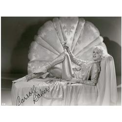 Vintage glossy 9.5 x 7 photo of a barefoot Baker on a chaise lounge, signed in fountain pen “Carroll Baker.” In fine condition, with spotting to the e
