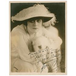 Vintage matte-finish 7 x 9 photo of Bara snuggling with a canine pal, signed and inscribed in fountain pen “Mr. & Mrs. Rollin H. Masters—Yuletid...