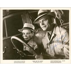 Vintage glossy 10.25 x 8 RKO Pictures publicity photo from Here We Go Again featuring Bergen and Charlie McCarthy, signed and inscribed in fountain pe