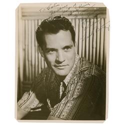 Vintage matte-finish 8 x 10 photo of a reclining Boyer, signed and inscribed in fountain pen “To Miss Dorothy Hoskins, Sincerely, Charles Boyer.” In f