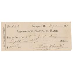 Renowned American Shakespearean actor (1833–1893) and brother of Lincoln assassin John Wilkes Booth. Bank check, 6.5 x 2.75, filled out and signed by