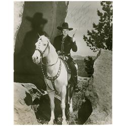 Glossy 7.5 x 9.5 photo of Hopalong Cassidy atop his horse, signed and inscribed in black ballpoint “To My Pal Thomas, Good Luck, Hoppy.” In fine condi