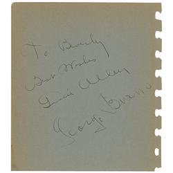Vintage fountain pen signatures, “To Beverly, Best wishes, Gracie Allen,” and “George Burns,” on a gray 5.75 x 6.5 album page. In fine condition, with
