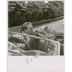 Vintage glossy 8.25 x 10 photo or Burton admiring his canine companion, signed in fountain pen. In fine condition, with two punch holes at the top bor