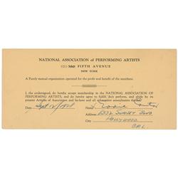 DS, signed “Eddie Cantor,” one page, 8.25 x 3.75, September 12, 1938. National Association of Performing Artists agreement. In part: “I, the undersign