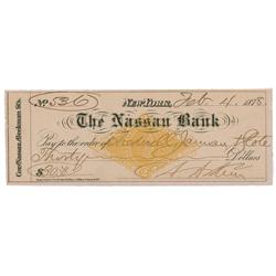 Bank check, 7.5 x 2.5, filled out in another hand and signed by Arthur, payable to Tredwell, Jarman, & Slote for $30.00, February 4, 1878. In fi...
