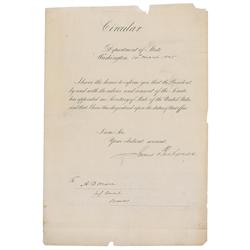 Printed circular, signed at the conclusion in ink, “James Buchanan,” one page, 8 x 11.5, dated March 10, 1845. Sent to A. D. Mann, the US Consul in Br