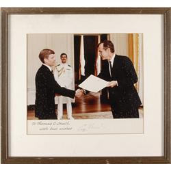Color satin-finish 8.25 x 7.25 photo of Bush presenting a citation to another man, inscribed in a calligrapher’s hand “To Thomas C. Shull, with best w