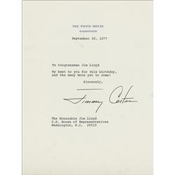 TLS as president, one page, 6.75 x 9, White House letterhead, September 25, 1977. Brief letter to Representative Jim Lloyd. In full: “My best to you f