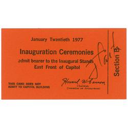 Two items: 1977 inauguration ticket, 4.5 x 2.5, signed on the front in black felt tip, “J. Carter”; and a White House card, signed in black ink, “Rosa