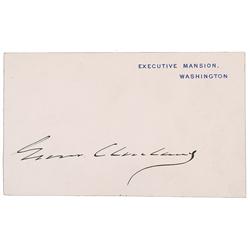 Signed Executive Mansion card, trimmed to a size of 4 x 2.5, signed in black ink, “Grover Cleveland.” Aforementioned trimming and a bit of scattered l