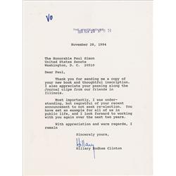 TLS signed “Hillary,” one page, 6.25 x 8.5, White House letterhead, November 28, 1994. Letter to Senator Paul Simon. In part: “I was understanding, bu