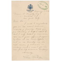 ALS, one page, 5.75 x 9, Lakeside Inn letterhead, February 3, 1930. Letter to Darwin P. Kingsley. In full: “I wish to congratulate you on the record b
