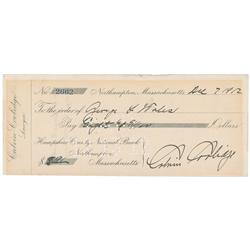 Business check, 8.25 x 3.5, filled out and signed by Coolidge, payable to George F. Wales for $8.91, December 7, 1912. Two vertical folds, one through