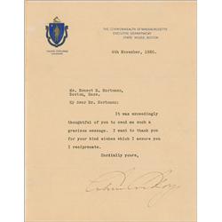 TLS, one page, 7.25 x 9.5, Commonwealth of Massachusetts letterhead, November 4, 1920. Short letter of thanks. In full: “It was exceedingly thoughtful