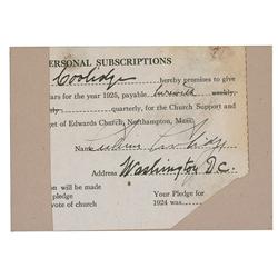 Partial DS, signed “Calvin Coolidge,” one page, 3.25 x 3, no date. Portion of a Northampton, Massachusetts, church subscription slip from 1925. Affixe