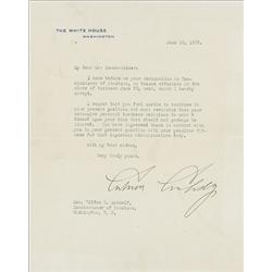 TLS as president, one page, 7 x 9, White House letterhead, June 10, 1925. Coolidge accepts the resignation of his Commissioner of Pensions. In full: “
