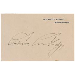 White House card, signed in fountain pen “Calvin Coolidge.” Uniform toning and a spot of spoiling at the bottom edge and mounting remnants on reverse,