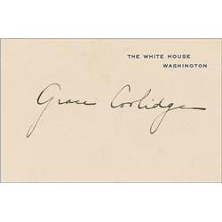 Signed White House card, signed in black ink, “Grace Coolidge.” In fine condition, with a bit of scattered light soiling, and a strip of adhesive remn