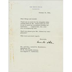 Rare TLS as president signed “Uncle Ike,” one page, 6.75 x 9, White House letterhead, October 15, 1960. President Eisenhower writes his cousin, Lowell