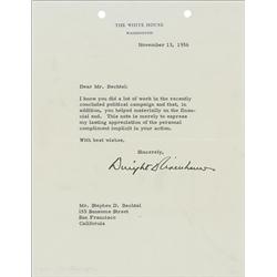 TLS as president, one page, 7 x 9, White House letterhead, November 13, 1956. Letter of thanks to a campaign supporter. In full: “I know you did a lot