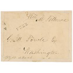 Free franked mailing panel, 4 x 2.75, addressed in Fillmore’s hand to “G. M. Fowle, Esq., Washington,” and franked along the top, “Free, M. Fillmore.”