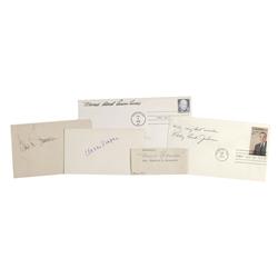 Five items: ink signatures, “Eleanor Roosevelt,” on an off-white 3.5 x 1.75 slip clipped from a larger letter, “Nancy Reagan” on an off-white 5 x 3 ca