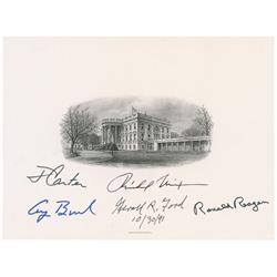 Engraved portrait of the White House, 8 x 6, by the Bureau of Engraving and Printing, signed in black ink, “Richard Nixon,” in black felt tip, “Gerald