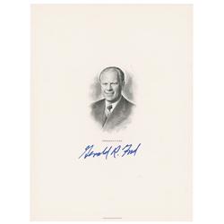 Engraved portrait, 6 x 8, by the Bureau of Engraving and Printing, signed in blue felt tip, “Gerald R. Ford.” In fine condition.