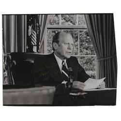 Glossy photo of Ford at his desk in the Oval office reading Richard Nixon’s presidential pardon, trimmed to a size of 17 x 14, signed in gold ink, “Pr