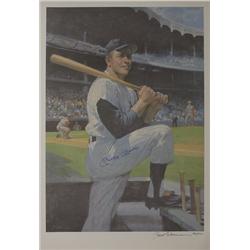 Fabulous color limited edition 25.5 x 38 lithograph, numbered #537/777, of Mantle in the Yankees home dugout, a bat perched on his shoulder, signed in