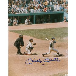 Color glossy 8 x 10 photo of Mantle at the plate in his Yankee pinstripes, signed in blue felt tip. In fine condition.