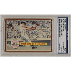 Topps 1962 baseball card, #234, of Maris hitting a game winning home run in Game 3 of the 1961 World Series, signed on the image side in black ink by