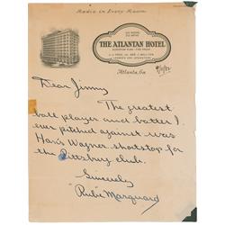 ALS, one page, 6 x 7.75, Atlantan Hotel letterhead, September 11, 1932. Brief letter to a young fan’s question. In full: “The greatest ball player and
